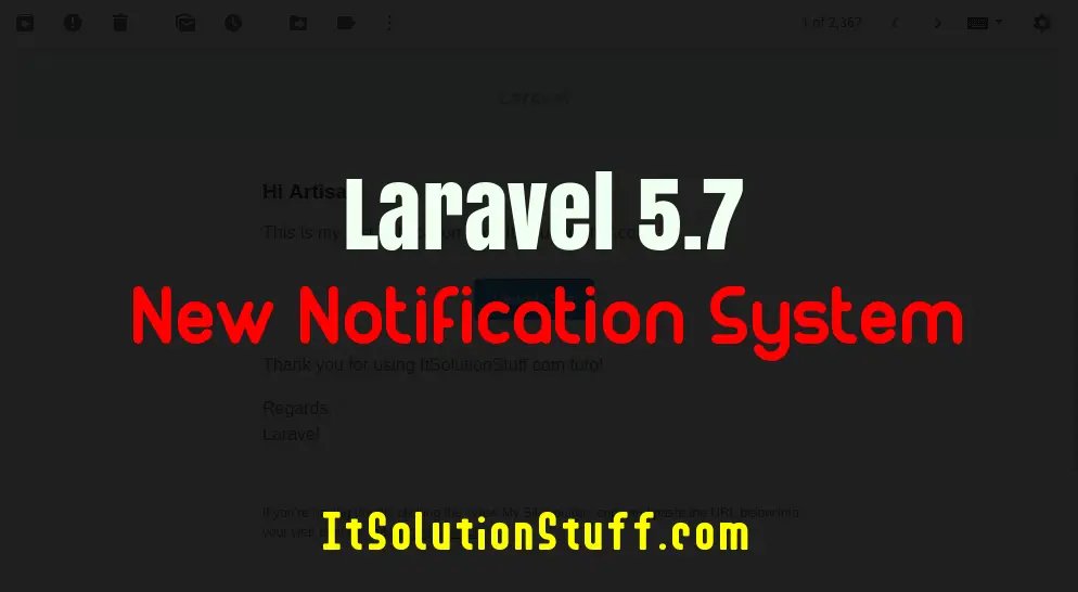 Laravel 5 added new feature as notification system with mail, database, sms, markdown, broadcast, slack etc. in this tutorial i will show you simple example demo of email notification system in laravel 5.7 application. you can also send all users notification at a time by using new notification system.