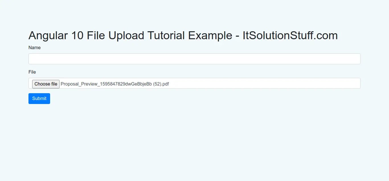 In this example, i want to share with you how to file upload with form data in angular 10. we will see example of angular 10 reactive form file upload. we will use reactive form with file upload in angular 10 step by step. i also created api for store file in folder using php for angular 10 file upload.