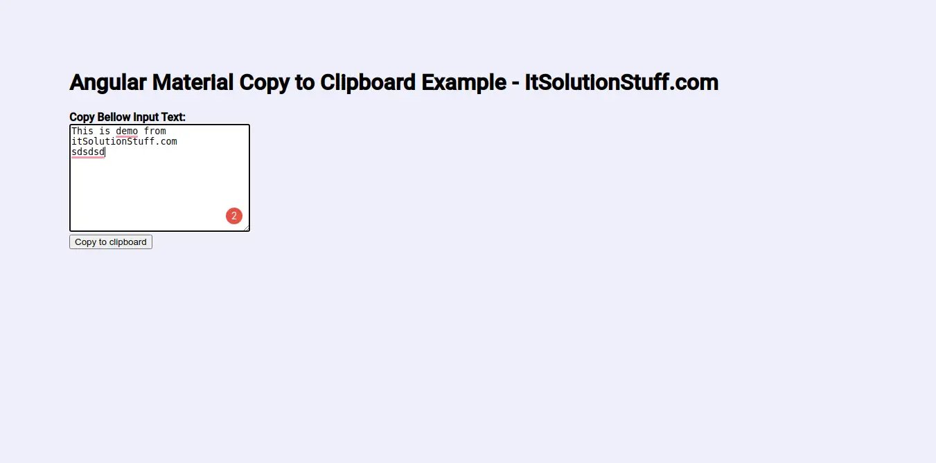 Here, i will give you two example one simple copy text using button click event with angular material. basically you can click on button and it will copied and you can paste text. second one we will copy text using entered input textarea value in button click event. so let' see both example one by one.