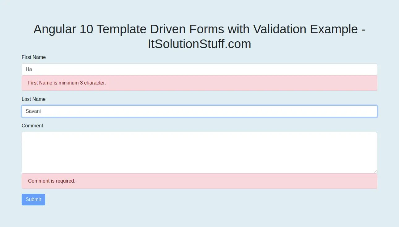 This article will provide some of the most important example angular 10 template driven forms. you can see template-driven form validation in angular 10. i would like to share with you angular 10 template-driven forms. Iām going to show you about angular 10 form validation on submit.