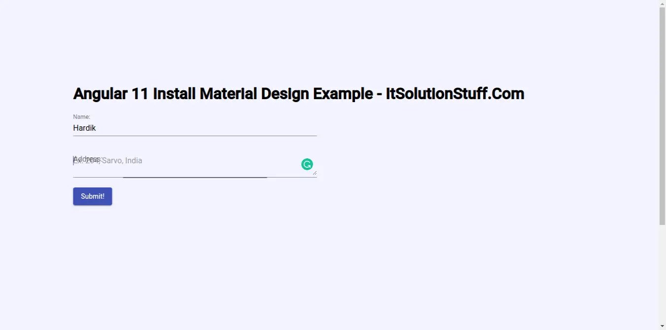 If you need to see example of how to install angular material in angular 11. letβs discuss about angular 11 install material design. letβs discuss about how to install material design in angular 11. you will learn angular 11 install material tutorial. follow bellow step for install material design in angular 11.