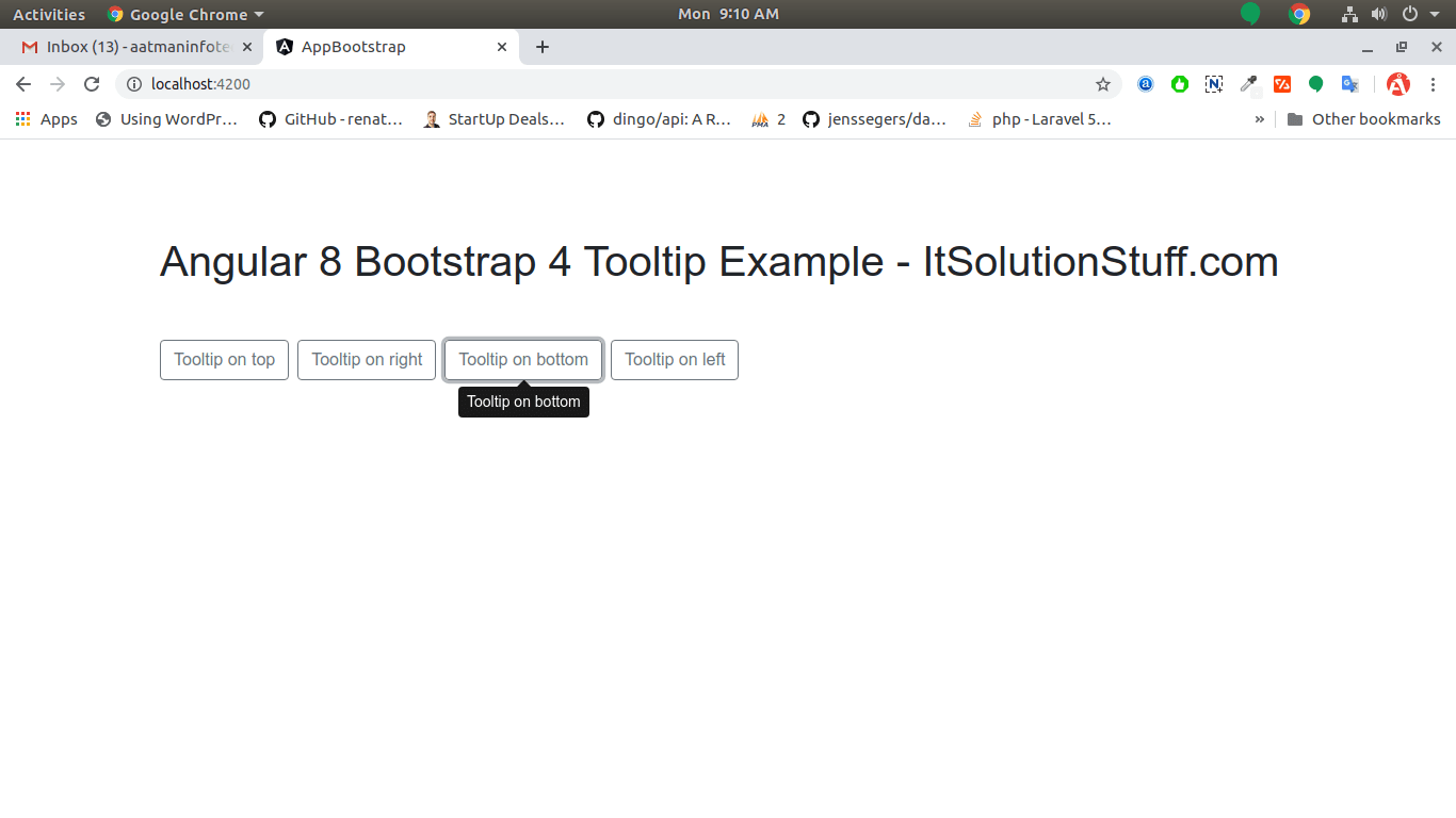 In this example, i will let you know how to use bootstrap tooltip in angular 10/9/8 application. we will see example of angular 10/9/8 bootstrap tooltip using ng bootstrap. i will give you very simple example of left tooltip, right tooltip, bottom tooltip and top tooltip example with angular 9/8 app.pup in angular 10/9/8 using Ng Bootstrap.