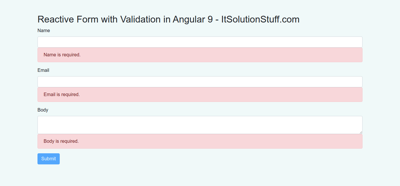 Today, angular 9 reactive form validation on submit is our main topic. step by step explain how to use reactive forms in angular 9. this example will help you reactive form validation in angular 9. step by step explain reactive form in angular 9 example.