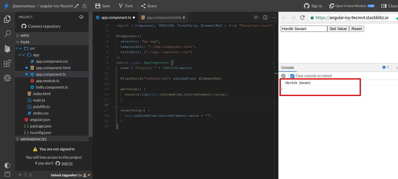 Here, we will simply take one input text box field with two buttons call "get value" and "reset value". when you click on get value button then we will get value using ElementRef id and when you click on the reset button then we will set the value using ElementRef id.
