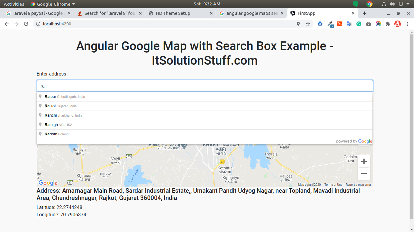 You can easily use google maps with places search in angular 6, laravel 7, angular 8, angular 9, angular 10 and angular 11 application.