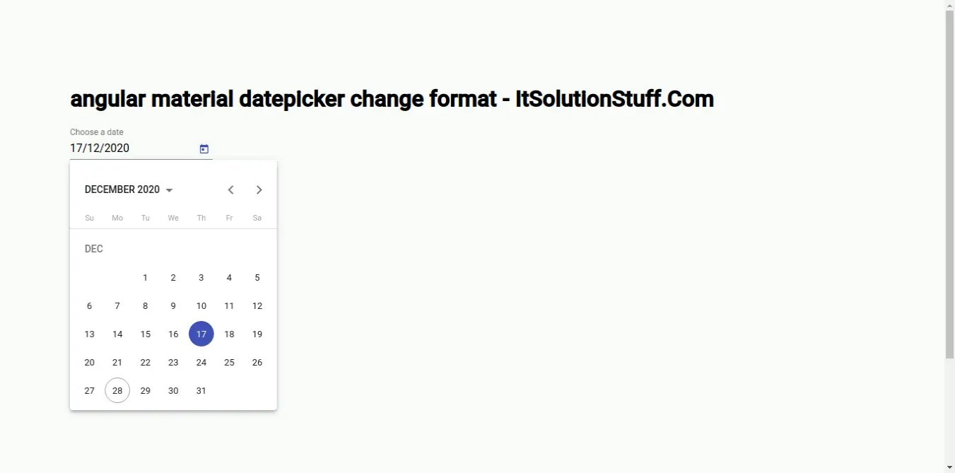 This article will provide example of angular material datepicker change date format. This tutorial will give you simple example of how to change date format in angular material datepicker. if you want to see example of angular datepicker format dd/mm/yyyy then you are a right place. Iām going to show you about angular datepicker format yyyy-mm-dd.