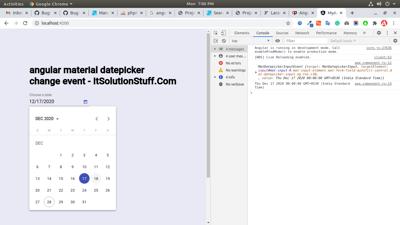 I am going to show you example of angular material datepicker change event example. if you want to see example of angular datepicker change event then you are a right place. We will look at example of material datepicker change event angular. you can see angular material mat-datepicker change event. Follow bellow tutorial step of material ui datepicker onchange event.