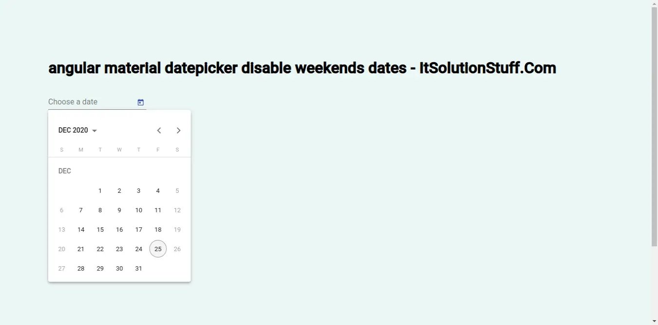This example is focused on angular material datepicker disable weekends. you'll learn angular material datepicker disable sunday and saturday. This post will give you simple example of angular datepicker disable weekends. Here you will learn how to disable weekends in datepicker angular. Alright, letβs dive into the steps.