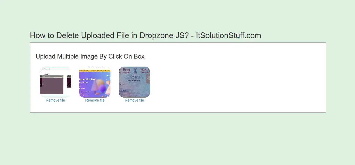 Now, let's see article of dropzone remove uploaded file. it's simple example of dropzone delete uploaded file example. We will look at example of remove uploaded file dropzone php. you will learn php dropzone remove uploaded file example.