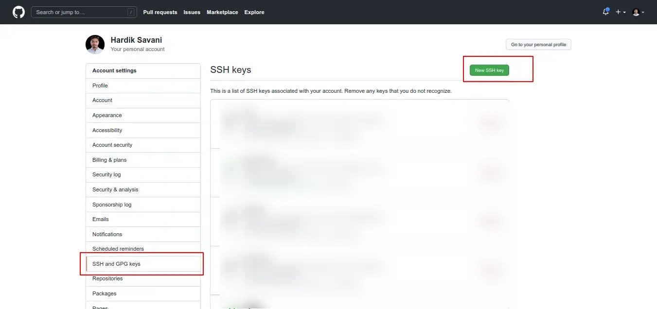 Step 3: Now click on Left side "SSH and GPG" list and click on New SSH Key button as like bellow: