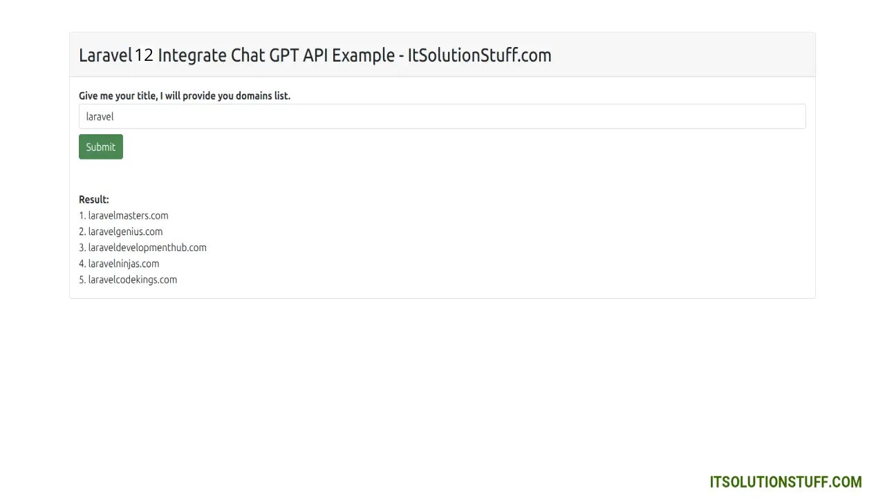 <h3 class="card-header p-3">Laravel 12 Integrate Chat GPT API Example - ItSolutionStuff.com</h3>