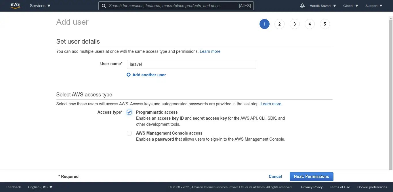 6. Next Add User Name and select "Programmatic access" from access type. then click on next.
