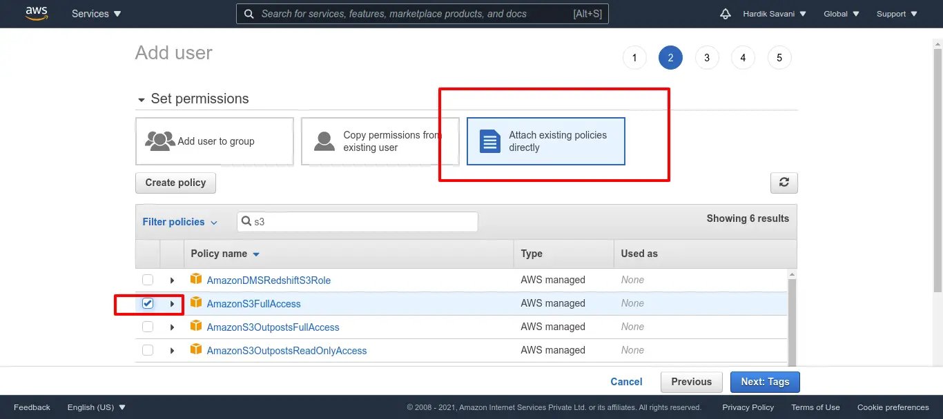 7. Next Select “Attach Existing Policy Directly†and choose "AmazonS3FullAccess" from permission link.