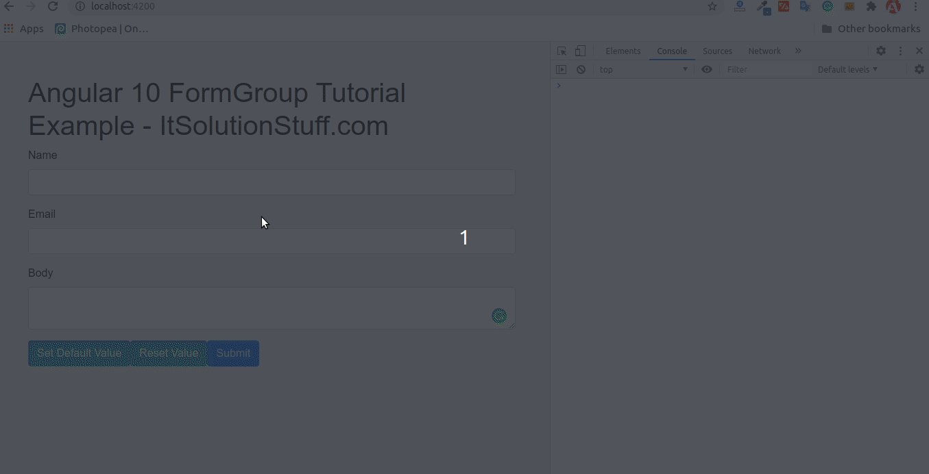 As above you see how to create formgroup, now i will show you full example of how to create formgroup and how it works with html view file. I also add two buttons "Set Default Value" and "Reset Value". Using that buttons we will reset values and set default value using FormGroup.