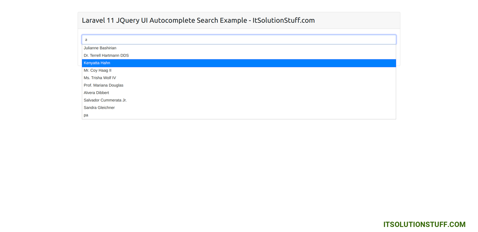 In this example, we will download the fresh Laravel 11 app and run migration for creating users table. Then we will create some dummy users using Tinker. Then we will create a simple blade file with the input field. We will use the autocomplete() function of jQuery UI and call AJAX request to get data on the change event. So, let's see the simple example code step by step.