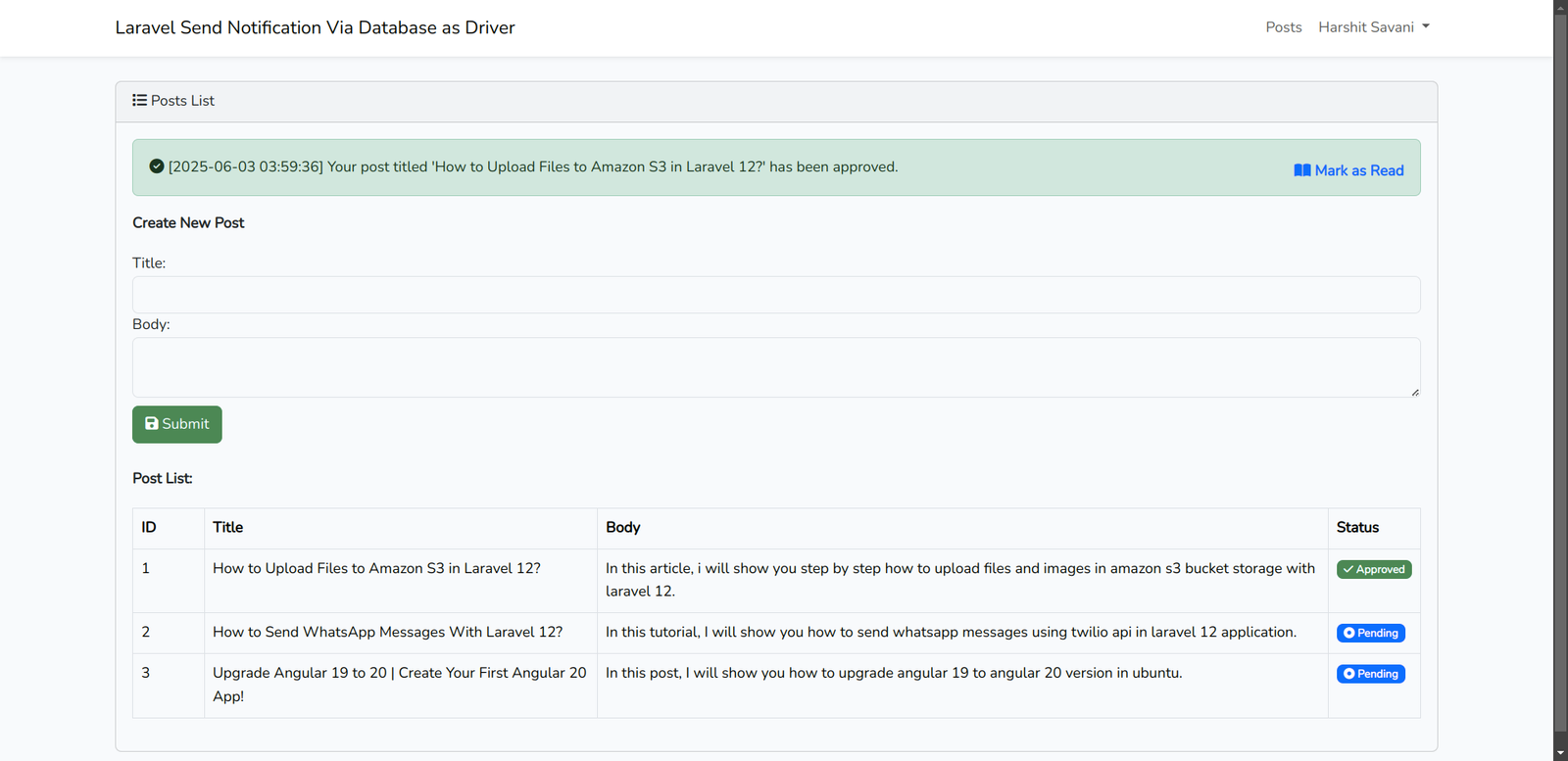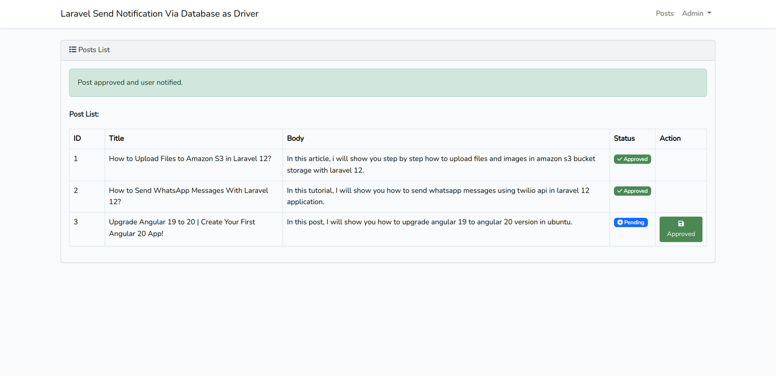 5. Once a post is approved, the user will get a notification stored in the database.