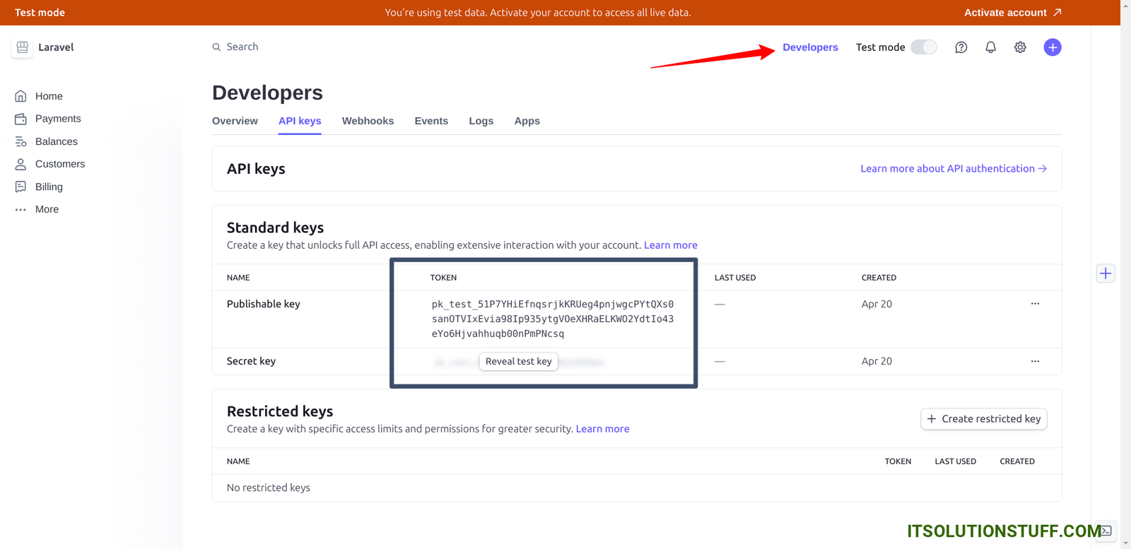 4. Now, you need to click on "developers" link on header and copy Stripe key and secret.