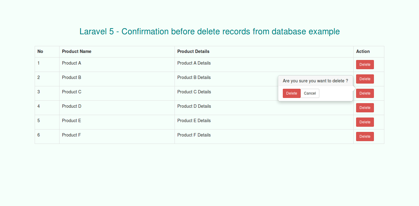 <h3>Laravel 5 - Confirmation before delete records from database example</h3>