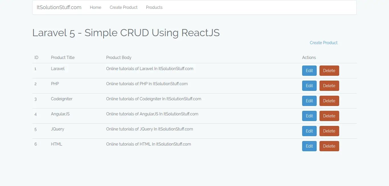 In this post, i want to share with you how to create crud(Create Read Update Delete) application with react js in PHP Laravel framework. In this example you can learn how to built setup for laravel reactjs application, I also used axios post request, get request, put request and delete request for insert update delete application.