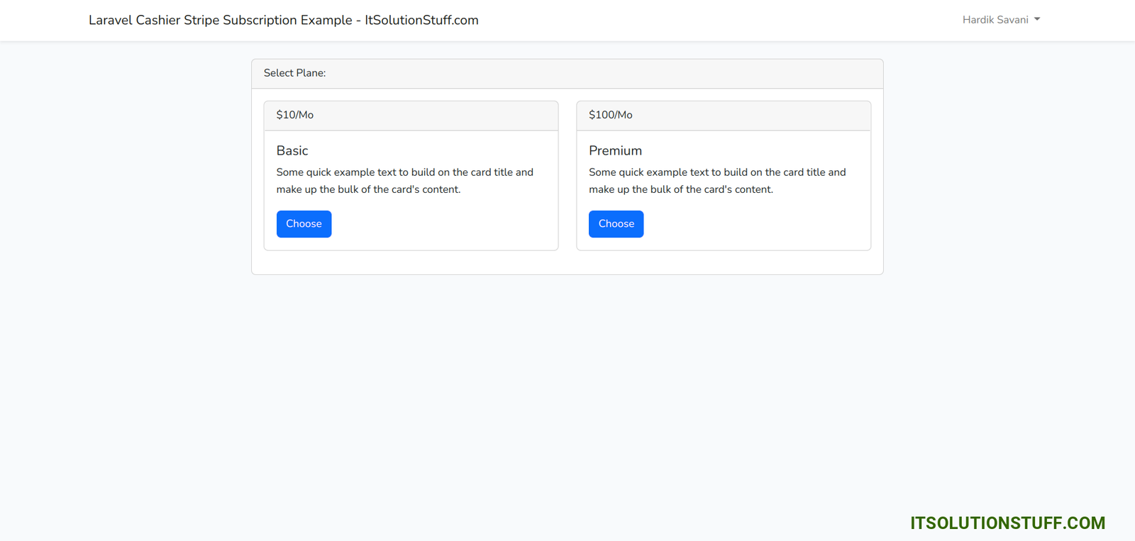 In this example, I will show you step-by-step how to implement a stripe subscription using laravel cashier. In this example, we will create Basic and Premium two plans with it's price. The user can choose one of that two plans. based on the plan user will get features. You can see the below preview as well. So let's see the below steps and get it done with your app.