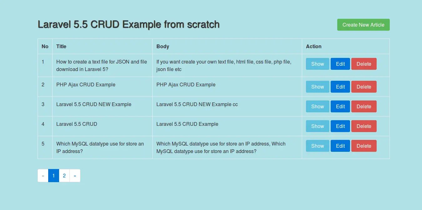 Here, i will create insert, update, delete and view with pagination example of articles. You can simply create new article, view article, edit article and remove article from lists. I make very simple example using Laravel Form builder using resource route. I make resource controller for crud application in laravel 5.5. So you have to just follow few step and get full example of CRUD application. end of article you will get layout like as bellow screen shot.