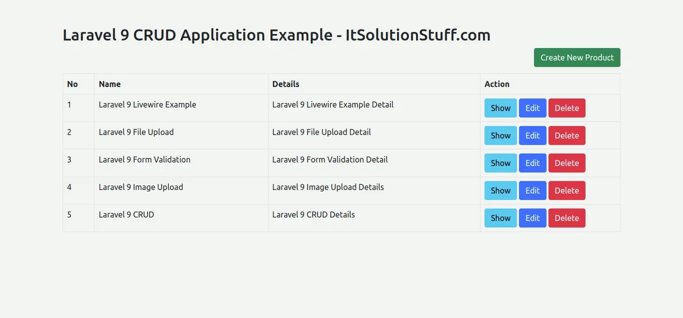 In this example, we will create a product crud application using laravel 9. we will create a products table with name and detail column using laravel 9 migration, then we will create routes, controller, view, and model files for the product module. we will use bootstrap 5 for design now. so let's follow the below step to create a crud operation with laravel 9.