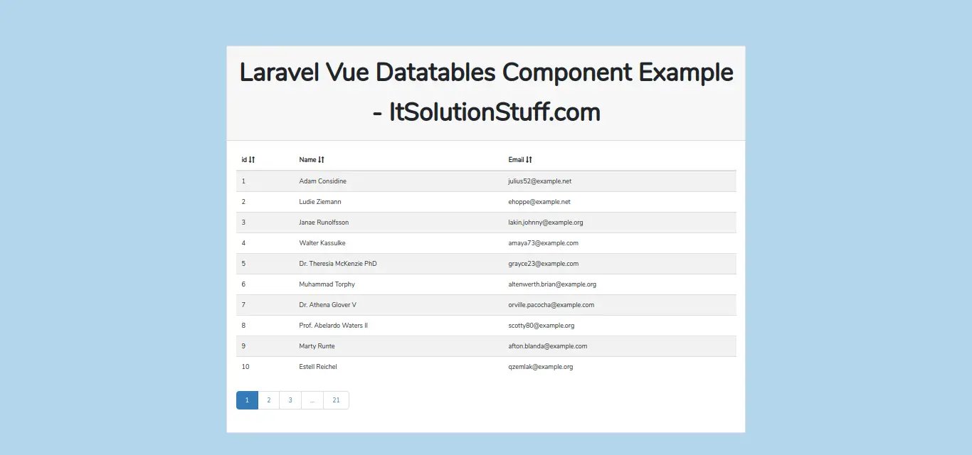 In this tutorial, i want to share with you how to implement datatables with vue js laravel. i will share simple example of vue datatable in laravel 5.8 application using vuejs-datatable npm. we will use vuejs-datatable component for vue datatables in laravel 6, laravel 7, laravel 8, laravel 9, laravel 10 and laravel 11 app.
