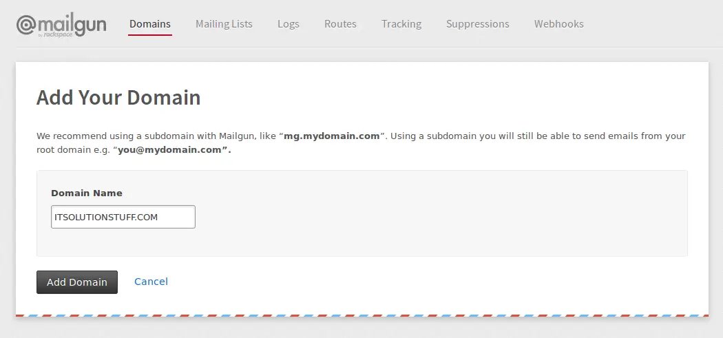 Ok, now we need to add secret and domain of mailgun api configration. So first create new account in mailgun.com SignUp if you don't have before. After registeration active your mailgun account and click on Domails and click on Add New Domail button. then you can see bellow screen.