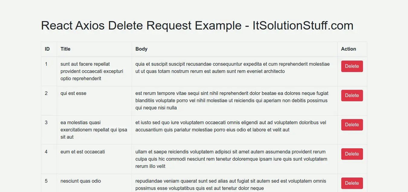 In this example, i will show you react axios delete request example. Iām going to show you about axios delete request in react js. Iām going to show you about axios delete request example react js. you'll learn http delete request in react js.