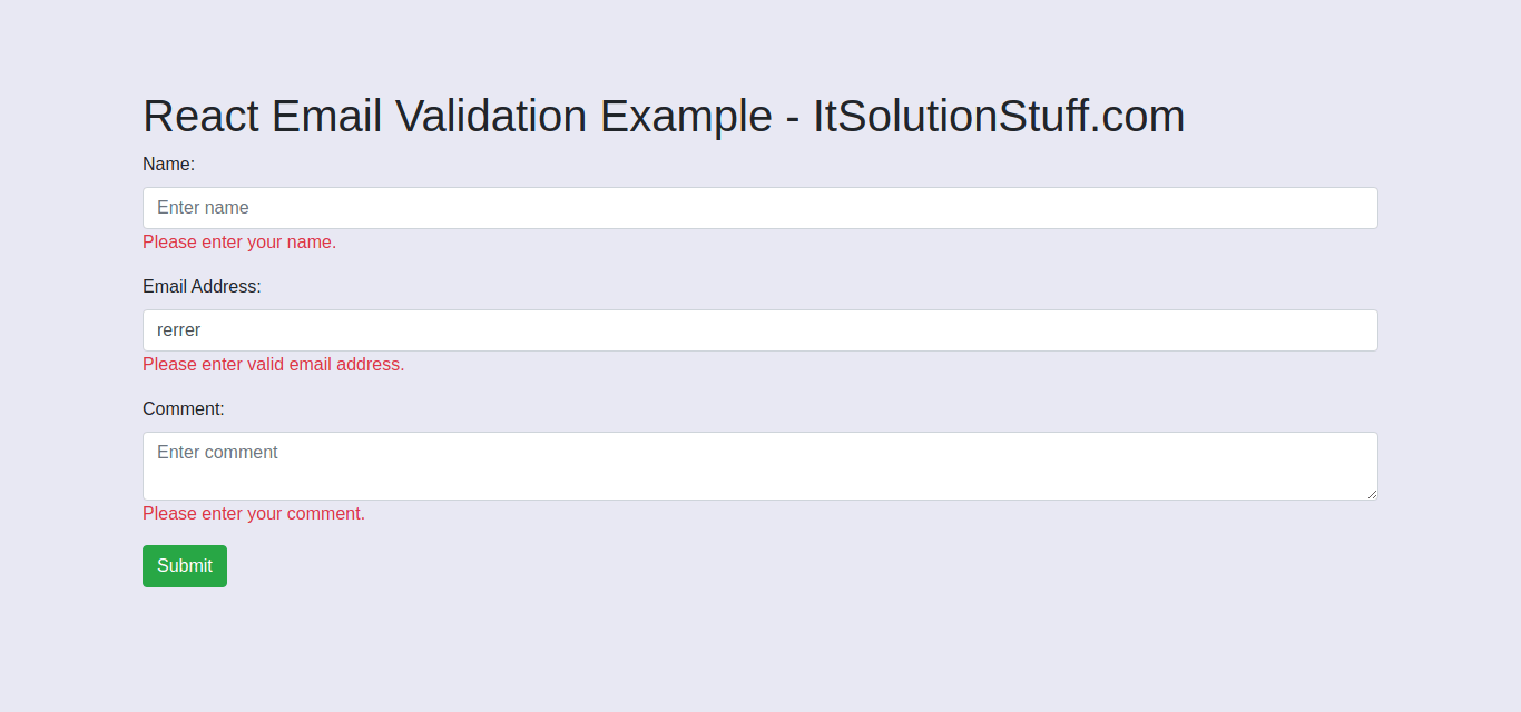 So, here i will give you step by step instruction of how to add email address validation in react js application. in this example we will take name, email and comment input and add validation for require and email now. also display error messages if they enter wrong values.