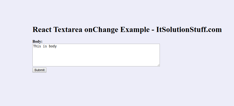 In this example, we will take simple "body" input textarea field and add onchange event with handleChange() then we will assign value on state variable array. Then on submit event we will take that values with state variable.